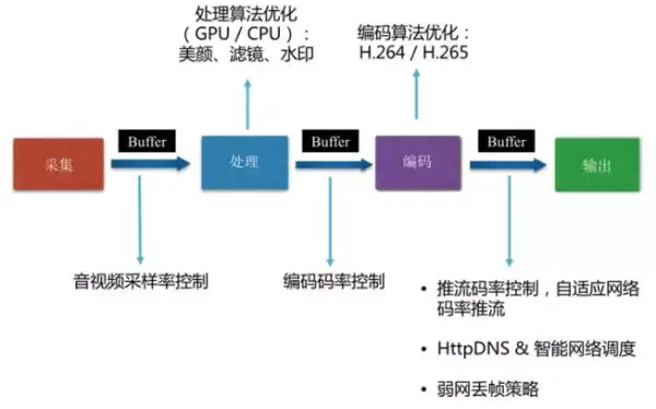 - 处理环节:这个环节包括滤镜、美颜、水印等处理功能,一般使用 GPU 对视频进行处理。处理和编码之间的 Buffer 主要用于控制编码效率和编码码率。