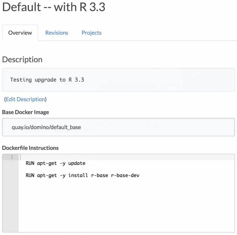 Domino允许通过运行Docker命令来指定环境的内容。为了更好的展示它,我们假设默认环境是R 3.2版本,而你想升级到R 3.3。出于谨慎,我们可以先在自己的项目上测试这个更改,以验证它是否能正常工作,然后再推送给大家。