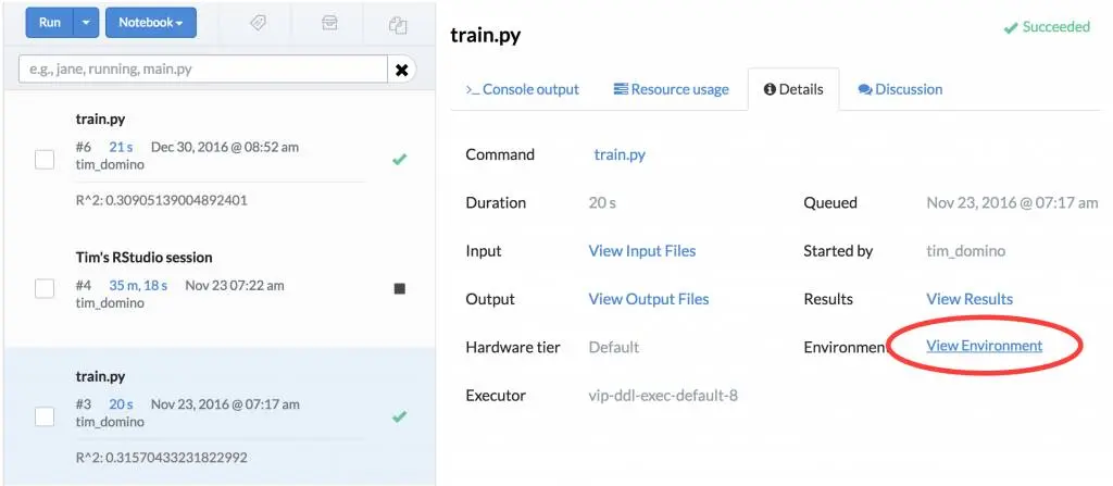 更进一步的,除了在更改环境后比较实验结果之外,Domino还可以配置为在代码运行时保留环境状态的文本快照,这样可以允许我们通过差异比较来快速找出哪些包或软件可能在同一实验的两次不同运行之间更改。