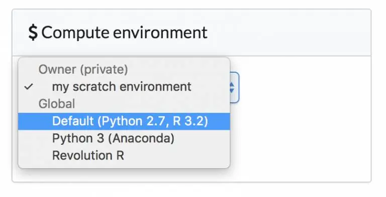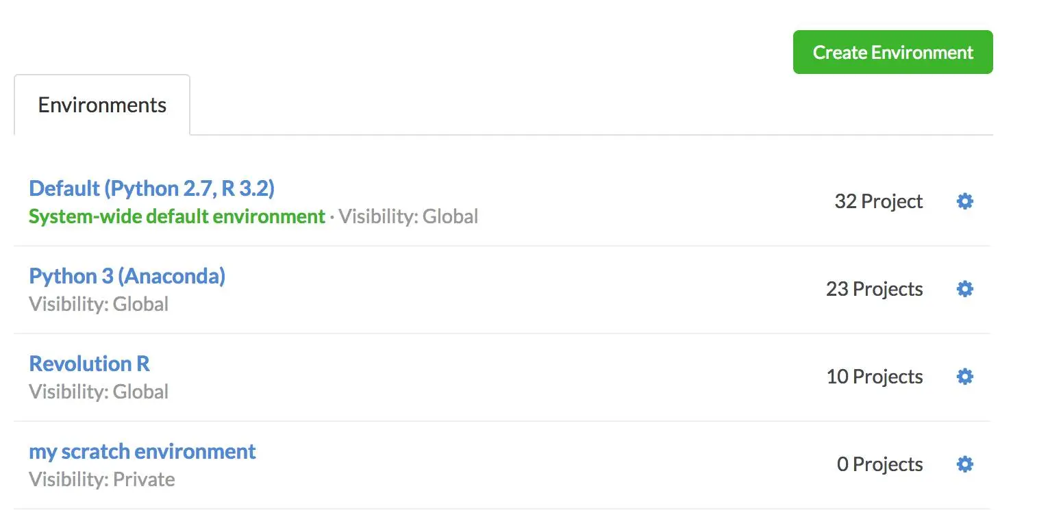 假如你的一些用户使用Python3,一些使用Python2。或者一些用户使用标准R发行版,一些使用Revolution Analytics的R发行版。你可以为每个配置创建环境,数据科学家可以选择他们工作时所需要的: