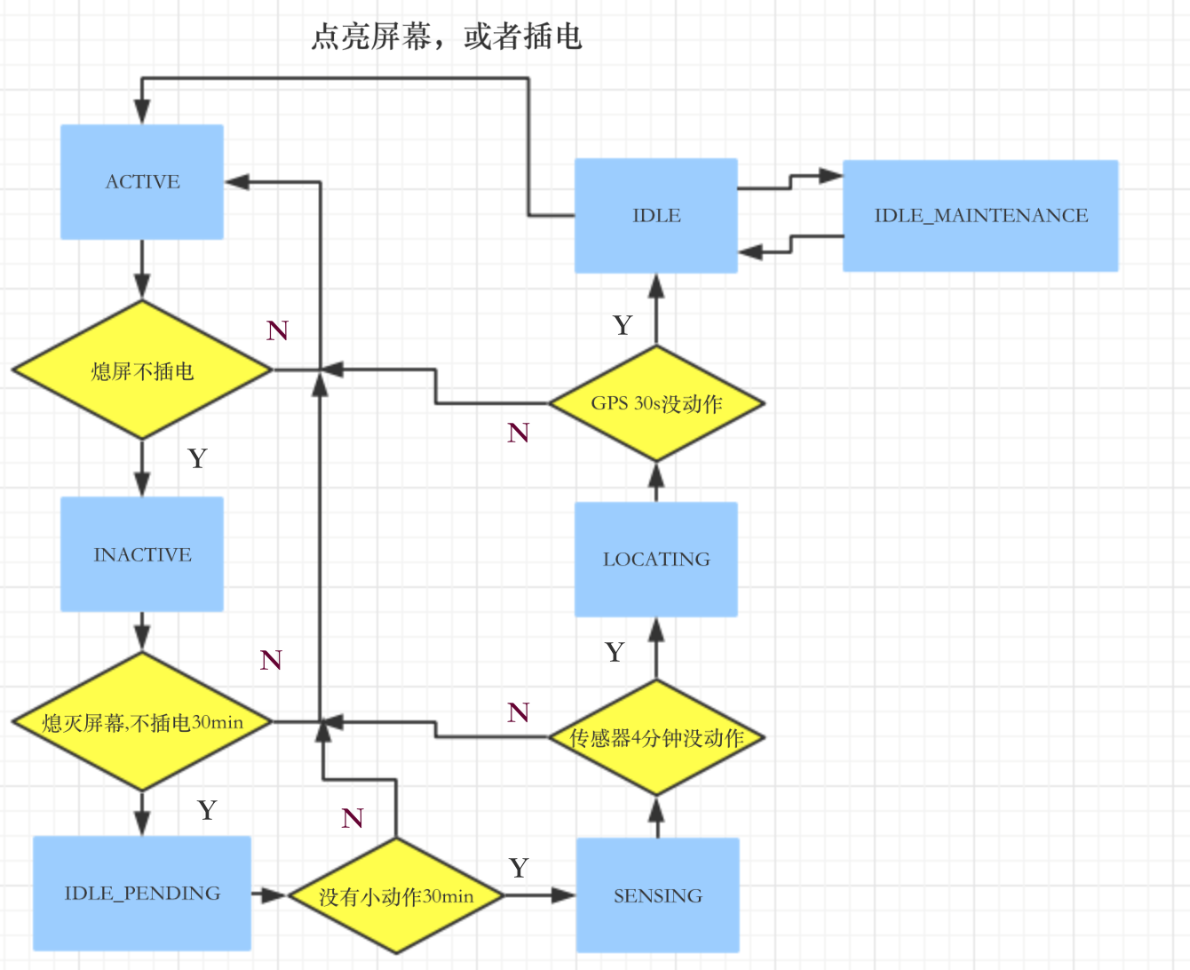 下面给张状态转换图看看,没到达idle状态前,基本上有什么风吹草动都会变回ACTIVE状态。而变成IDLE状态后,只能插电或者点亮屏幕才离开IDLE状态。就像人入睡前,很容易被吵醒,而深度入眠后,估计只有闹钟能闹醒你了!!