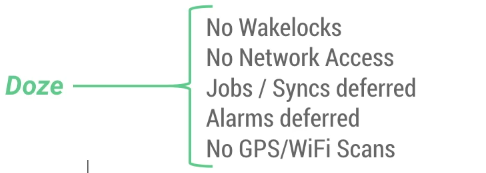 上图是谷歌的Doze时序示意图,可以看出让手机打盹要满足三个条件
