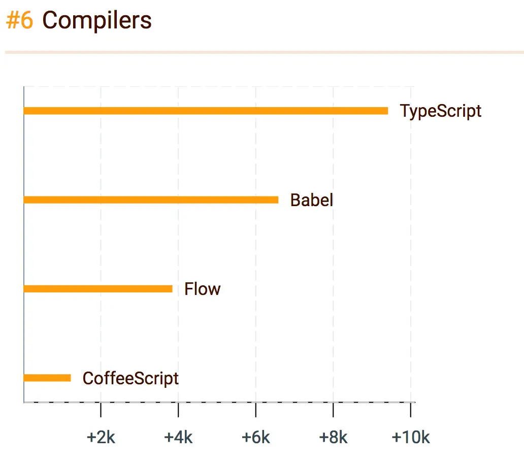 多年来,CoffeeScript由于其精简语法(灵感来自Python和Ruby语法),成为最受欢迎的编译器,但它在2016年不太流行,很多开发人员从CoffeeScript迁移到ES6与Babel。