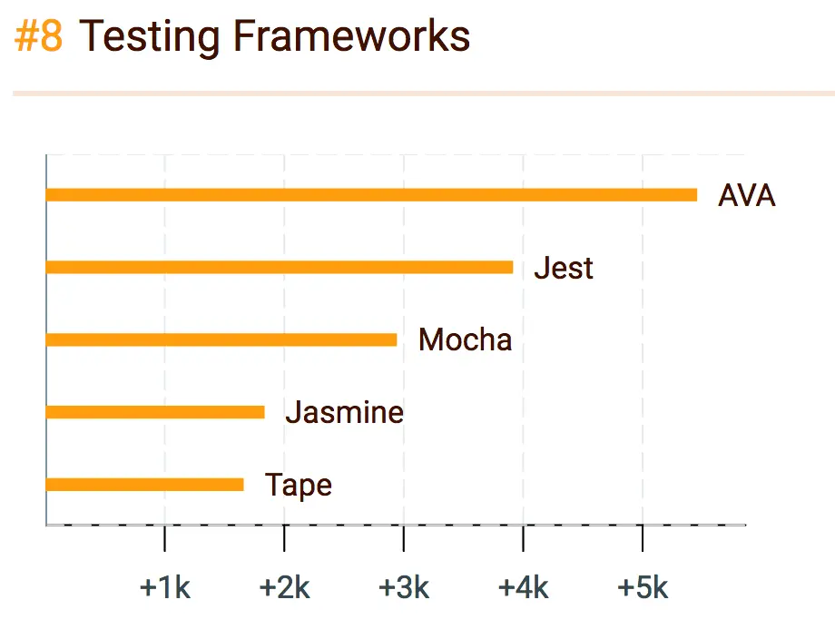 最著名的两个测试框架是Jasmine和Mocha,但最近的两个项目在2016年有更多的牵引力:AVA和Jest。