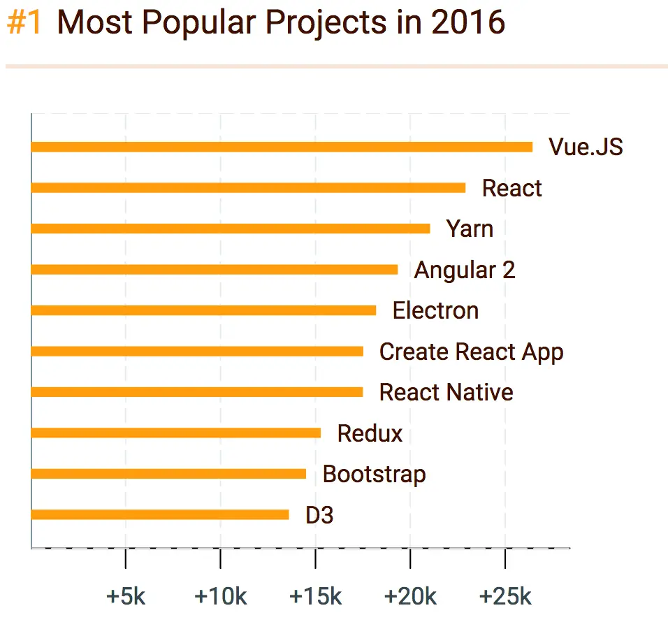 Vue.JS项目在去年的Github上获得了超过25,000颗星标,将包括React和Angular的其他框架甩在身后,一骑绝尘。