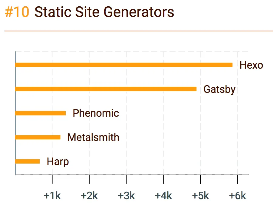 在2016年,使用node.js构建的最流行的SSG是Hexo。它是一个彻底的SSG,接近CMS系统,可用于构建一个博客,如Wordpress。它有很多功能,包括国际化插件。