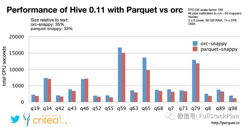 上图展示了Twitter在Impala中使用不同格式文件执行TPC-DS基准测试的结果,测试结果可以看出Parquet较之于其他的行式存储格式有较明显的性能提升。
