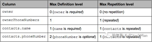 以contacts.phoneNumber这一列为例,"555 987 6543"这个contacts.phoneNumber的Definition Level是最大Definition Level=2。而如果一个contact没有phoneNumber,那么它的Definition Level就是1。如果连contact都没有,那么它的Definition Level就是0。
