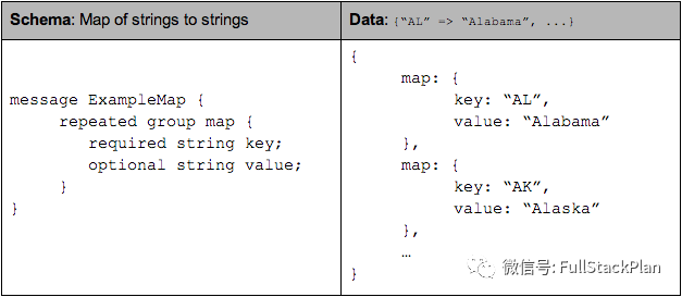 Parquet格式的数据类型不需要复杂的Map, List, Set等,而是使用repeated fields 和 groups来表示。例如List和Set可以被表示成一个repeated field,Map可以表示成一个包含有key-value 对的repeated group ,而且key是required的。