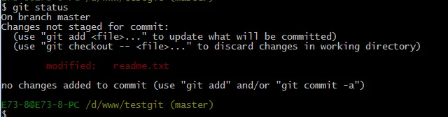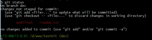 我们在readme.txt再添加一行内容为4444444,接着在目录下新建一个文件为test.txt 内容为test,我们先用命令 git status来查看下状态,如下:
