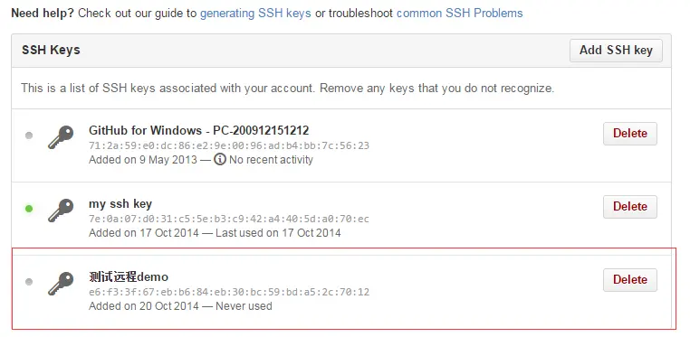 第二步:登录github,打开” settings”中的SSH Keys页面,然后点击“Add SSH Key”,填上任意title,在Key文本框里黏贴id_rsa.pub文件的内容。