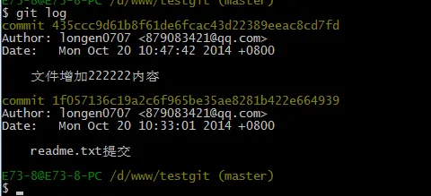 git log命令显示从最近到最远的显示日志,我们可以看到最近三次提交,最近的一次是,增加内容为333333.上一次是添加内容222222,第一次默认是 111111.如果嫌上面显示的信息太多的话,我们可以使用命令 git log –pretty=oneline 演示如下: