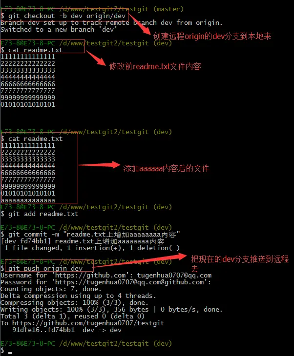 可以看到 推送成功了,如果我们现在要推送到其他分支,比如dev分支上,我们还是那个命令 git push origin dev