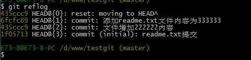 git reset --hard 版本号 ,但是现在的问题假如我已经关掉过一次命令行或者333内容的版本号我并不知道呢?要如何知道增加3333内容的版本号呢?可以通过如下命令即可获取到版本号:git reflog 演示如下: