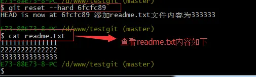 我们看到 增加333333 内容我们没有看到了,但是现在我想回退到最新的版本,如:有333333的内容要如何恢复呢?我们可以通过版本号回退,使用命令方法如下: