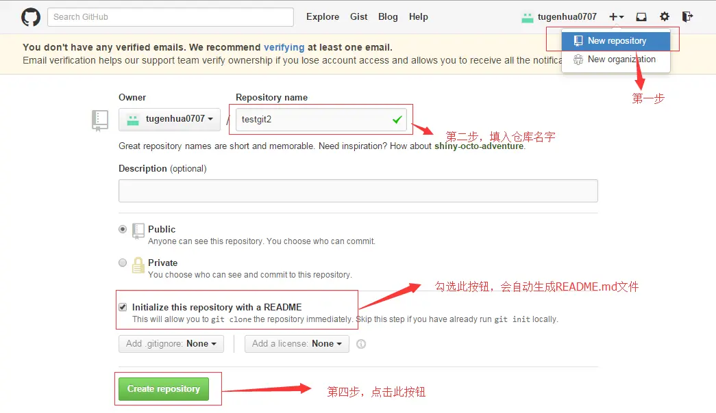 首先,登录github上,然后在右上角找到“create a new repo”创建一个新的仓库。如下:
