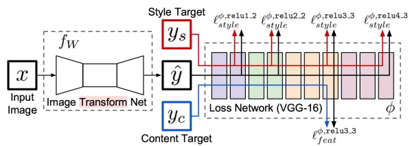 - loss network 网络结构同之前paper类似,这里主要是计算content loss和style loss, 注意不像neural style里面会对图像做像素级更新更新。
