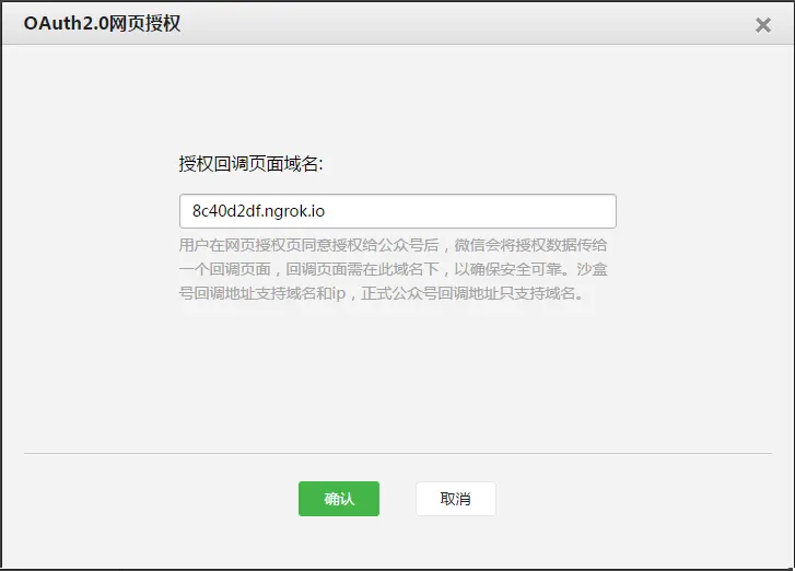 ngrok.io,因为我用的是Ngrok。 - 配置网页授权的回调域名: 在测试号页面的