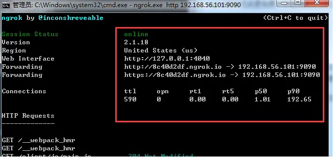 ngrok.exe http 192.168.56.101:9090 - 运行成功后的界面如下: