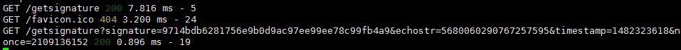 二者互相正确对应的话,当我们提交接口配置信息的时候是会提示配置成功的。如果配置失败,请确认一下微信的请求是否有被你的服务器处理,正常应该有如下的一条请求打印出来: