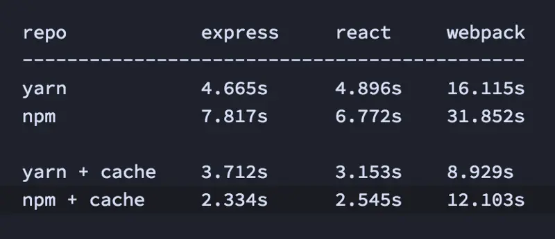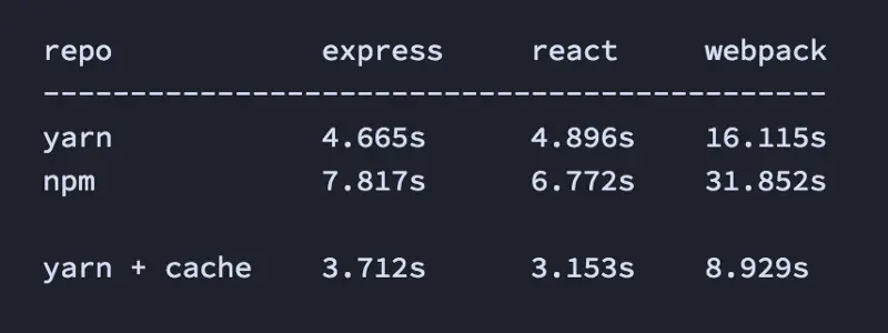 当Facebook 发布Yarn 的时候,JavaScript 社区一篇欢呼雀跃,因为Yarn 提供了惊人的安装速度。而且由于Yarn 会将安装过的Module 缓存在你的计算机本地,因此之后的安装速度还会变的更快。