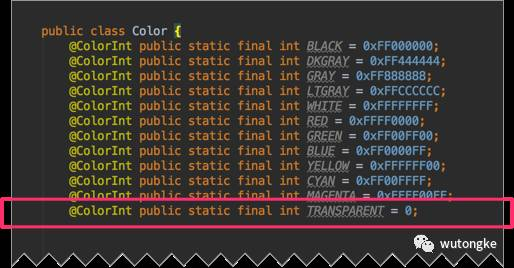 如果使用了@android:color/transparent,我们知道它代表全透明,但是在计算插值时,除了透明度,还有计算R、G、B,我们看一下 android.graphics中Color.Transparent的值: