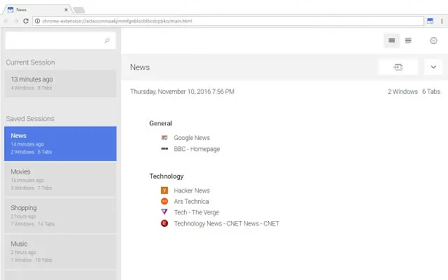 Session Buddy 是你强大的伙伴,它能帮你做很多事情,例如保存所有已经打开的标签,下次启动浏览器的时候自动重新打开、浏览器崩溃后重新所有标签、按照类别管理标签页、对标签页进行搜索、分享标签等。