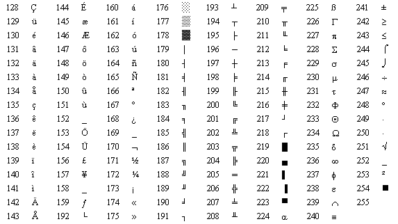 然而计算机慢慢地普及到其他西欧地区时,发现还有很多西欧字符是 ASCII 字符集中没有的,显然 ASCII 已经没法满足人们的需求了,好在 ASCII 字符只用了字节的前7位 0×00~0x7F 共128个字符,于是他们在 ASCII 的基础上把原来的7位扩充到8位,把0×80-0xFF这后面的128个数字利用起来,叫 EASCII ,它完全兼容ASCII,扩展出来的符号包括表格符号、计算符号、希腊字母和特殊的拉丁符号。然而 EASCII 时代是一个混乱的时代,各个厂家都有自己的想法,大家没有统一标准,他们各自把最高位按照自己的标准实现了自己的一套字符编码标准,比较著名的就有 CP437, CP437 是 始祖IBM PC、MS-DOS使用的字符编码,如下图: