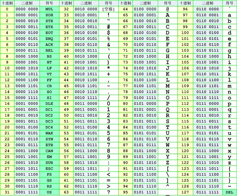 说到字符编码,要从计算机的诞生开始说起,计算机发明于美国,在英语世界里,常用字符的个数非常有限,26个字母(大小写)、10个数字、标点符号、控制符,这在计算机中用一个字节的存储空间来表示一个字符绰绰有余,因为一个字节相当于8个比特位,8个比特位可以表示256个符号。于是美国国家标准协会ANSI制定了一套字符编码的标准叫 ASCII(American Standard Code for Information Interchange),每个字符都对应唯一的一个数字,比如字符 "A" 对应数字是65,"B" 对应 66,以此类推。最早 ASCII 只定义了128个字符编码,包括96个文字和32个控制符号,一共128个字符只需要一个字节的7位就能表示所有的字符,因此 ASCII 只使用了一个字节的后7位,剩下最高位1比特被用作一些通讯系统的奇偶校验。