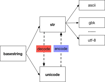 在 python2 中和字符串相关的数据类型有 str 和 unicode 两种类型,它们继承自 basestring,而 str 类型的字符串的编码格式可以是 ascii、utf-8、gbk等任何一种类型。