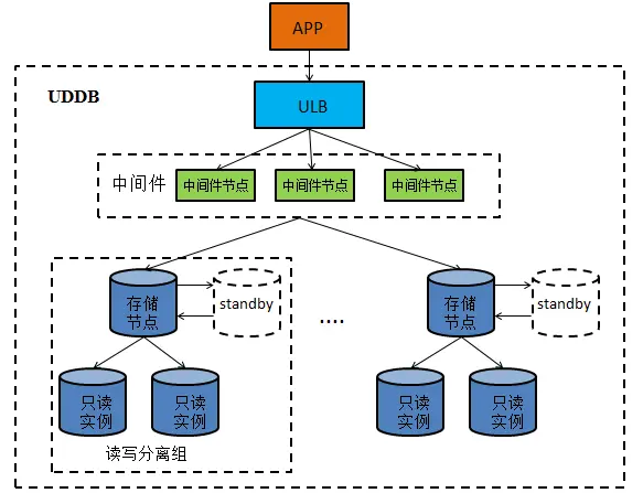 UCloud分布式数据库(UCloud Distributed Database,简称UDDB)是一种稳定、可靠、容量和服务能力可弹性伸缩的分布式关系型数据库服务。UDDB高度兼容MYSQL协议和语法,支持垂直建表、自动化水平拆分,在线平滑扩缩容,服务能力线性扩展,透明读写分离,具备数据库全生命周期运维管控能力。UDDB的架构设计如下图所示: