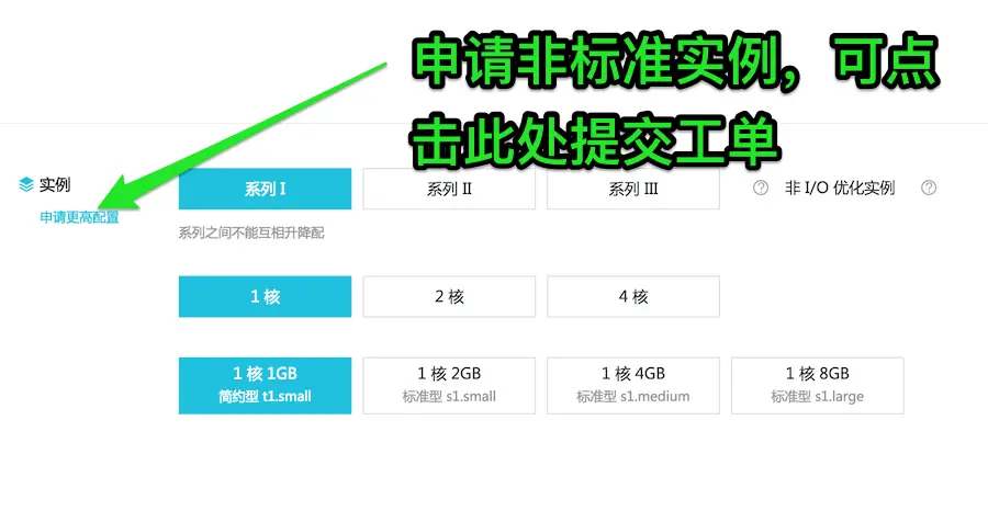 在实例的选择界面,根据不同系列,CPU核数和内存大小有若干固定搭配提供。CPU核数和内存的配比有四种:1:1(1核配1G内存)、1:2(1核配2G内存)和1:4(1核配4G内存)和1:8(1核配8G内存)。在上述的三个系列中,最低配置都有1核1G,而目前最高配置,竟然能选择到56核224G【注1】。如对实例有特殊需求(需要更多CPU核数或是更大的内存),则可如下截图所示填写工单,提交阿里云后台,由人工进行处理。