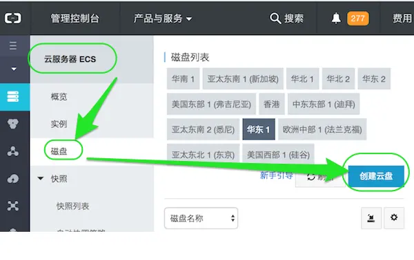 另外,如确需购买额外云盘,也建议采购独立型云盘。其购买入口位于“云服务器ECS”-"磁盘"下,如截图所示: