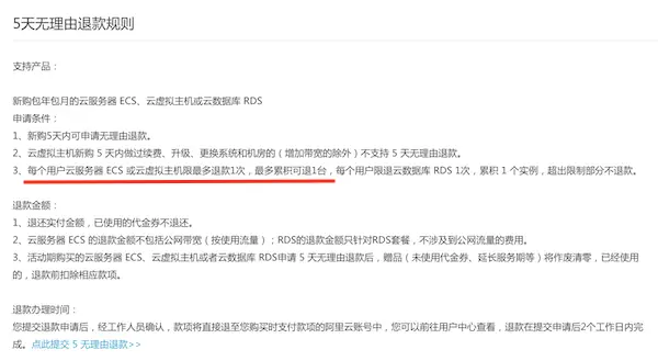 需要注意,包年包月ECS有5天内无理由退款的选项:在购买包年包月ECS后,发现配置有误,或是地域选择错误,或者任何其它原因,如距离购买生效时还未超过5天的,可以进行退款。但请注意,截止目前为止,该规定细则仍然是:每个用户累积只有1次ECS