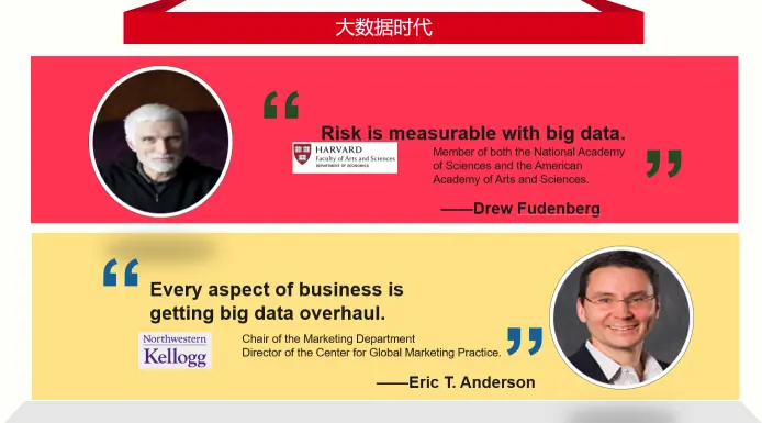 这两个人对我的影响非常大,让我的职业发展做出了改变。第一个是我在哈佛读书时候的教授,他是经济学系的教授,他的著作《博弈论》相信学经济的人都读过。他当时说了一句话“风险在大数据的情况下可以测量的”,这句话对我造成很大的触动,因为金融领域最大的问题就是没有办法测量未知的风险,如果可以测量风险很多问题迎刃而解,整个金融领域的工作方法都得以改变。第二个是Eric,他说“商业的每一个领域和角落都被大数据所改变了”,七八年前我在读书的时候,正是经历了这样一个过程。