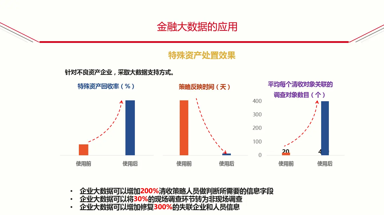 每个清收关联对象的调查数目也有变化,以前对于一个不良资产可能查3个子公司,调查20个人就结束,因为不知道该找什么人谈话,不知道该去什么地方看。用大数据以后调查的人和企业的数量增加了20倍之多,因为知道该去哪儿找这些人,调查对象多了,直接导致挽回率大幅度提高。