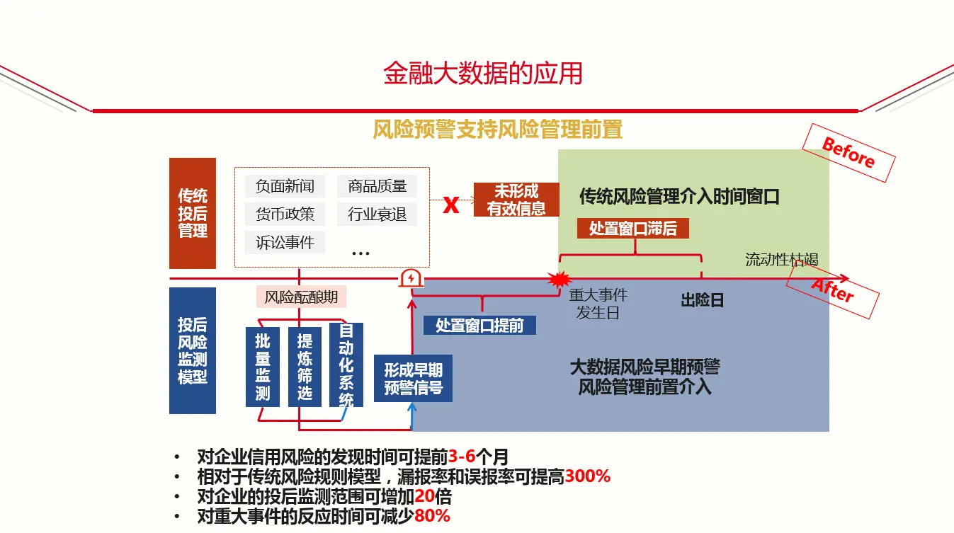 在投后管理中的应用,大数据所起到的应用是风险管理的前置。无论在银行、资本还是任何一个投资类型的公司,风控一般做什么?一般是企业出了事才会知道,现在很少有能力,或者有手段让他们提前知道风险。中国有很多基金券商,有时候我也和他们交流,你们每天上班怎么做风控?他们说一上班就读报纸,哪个公司有风险,就让我们查。这其实是非常无效的监管方式,他们没有有效的信息获取通道,如果等报纸报道后再去清收,很可能资产没有办法处置了。以前传统的介入窗口,很可能在重大事件报道以后才去处置。举个例子,资本市场债券没有流动性了,多的时候可能要折价40%到60%才能将这笔债券卖出去。