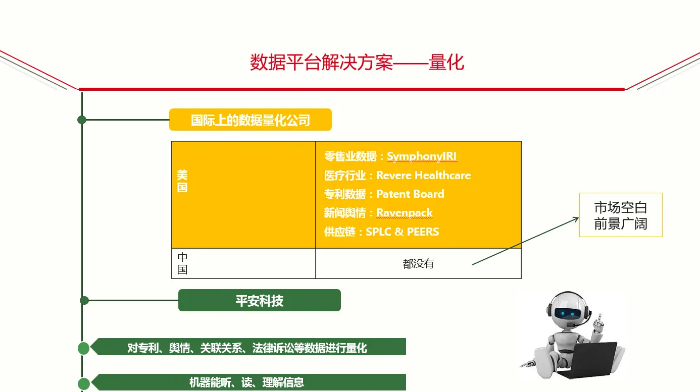 在中国进行企业大数据建设的时候,发现这些供应商基本上属于比较空白的状态,在金融领域没有一个比较成熟的量化企业数据供应商,提供每一个领域的细化服务。平安科技在这个领域做了领头羊的角色,我们率先拓展这个领域,对于专利、舆情、关联关系,法律诉讼等数据整合进行量化。我们做了一些研究,建立了大数据仓库,在这方面投入相当多的人力、物力和成本,对于中国的领域内做了一些行业对标,在数据量化领域,做了一些比较开拓性的工作。