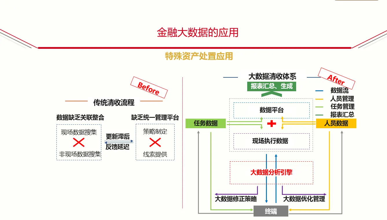 第三方面是策略的制订,比如说,是诉讼还是不诉讼,每一项都是一个策略。银行的支行人员,能不能在有限的数据支持下做出一个最佳的判断,这是很值得考究的问题。我们研究以往的案例和数据,发现银行客户经理做出来的判断,很多时候是错误的。明明有其他的业务可以合作,而不是直接推到诉讼台上。我们建成一整套基于大数据的清收体系,前端的业务人员,他们在现场收集出来的数据直接汇总到数据平台,他们每天的任务,今天跑了几个点,去了几个城市都汇集到这个平台,合成一个大数据分析引擎。自动通过规则判断,机器学习,判断出来哪一种是最佳策略,可以最大程度挽回不良损失。