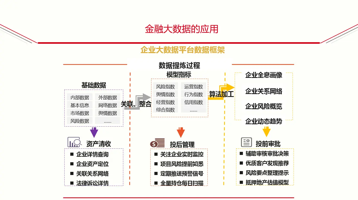 首先第一点是数据的框架,从左往右看,最左边是企业的基础数据,具体应用分为投前、投中和投后。投前一般是了解一个客户,要不要做这笔业务。投中是投的过程当中流程方面的监管。投后是成为了我们的客户以后,我们成为股东、借款方,需要对他们的风险进行监控,如果企业其他的债权价格有波动,我们要处置。
