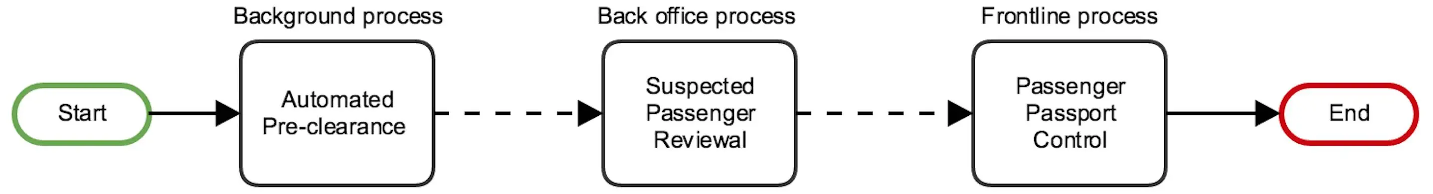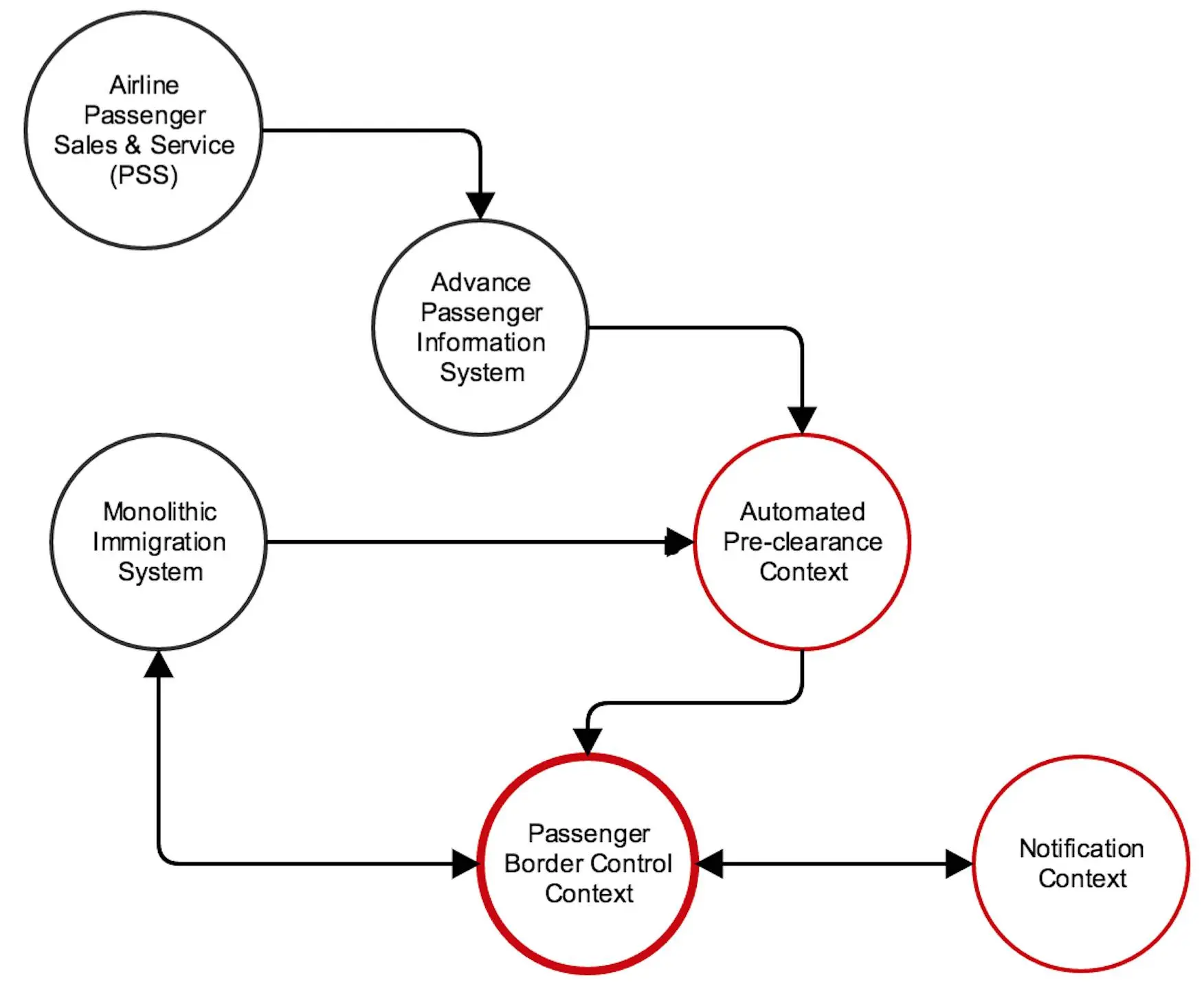 下一代值机系统(NGB)是一个护照管理系统的升级版本。NGB的主要目标是加快的乘客在机场的移民柜台的处理速度。该系统通过将处理时间平均从56秒减少到10秒,提高了乘客的体验。下面是该系统的处理流程图(http://martinfowler.com/bliki/BoundedContext.html)。
