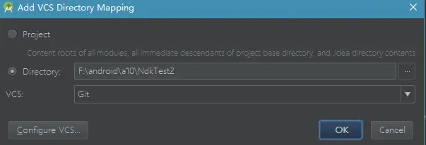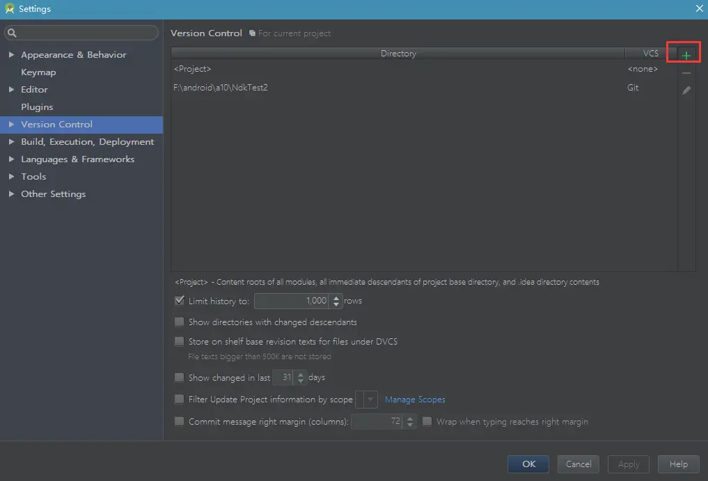 4、在version control中添加本工程的路径并选择git
