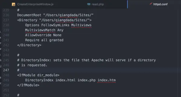 这是我们需要修改的第二个文件。找到 /etc/apache2/extra 目录下的 httpd-userdir.conf文件,打开,将16行的注释去掉,即: