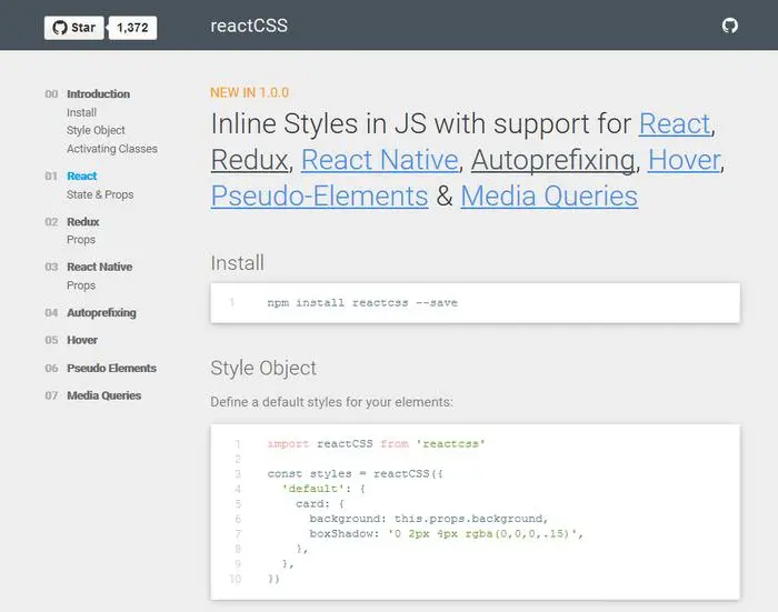 ReactCSS 让你可以在JavaScript 中添加inline CSS 样式。ReactCSS 支持React 、Redux 、React Nativeautoprefixing 、hover 、pseudo-element 和media 请求。你可以使用npm 对其进行快速安装。
