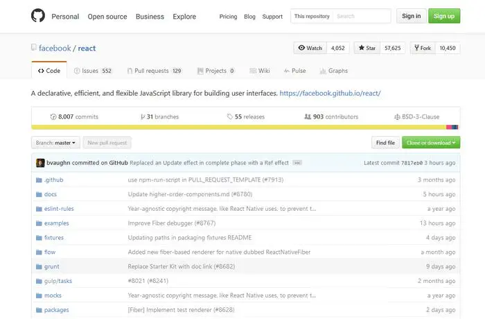 在这个repo 中,你可以查看React 的源代码。如果你想关注它最新的状态,你也可以查看各种issue 、里程碑以及最新的pull request 。在遇到问题的时候,你还可以查看它的Trouble Shooting Guide 。