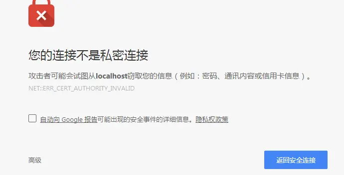 chrome会这样提示你,我们的浏览器里边找不到为这个服务器CA证书签名的CA证书,这很可能是一个骗子网站,这是因为我们的CA机构根证书没有被内置到chrome里边。点继续访问:
