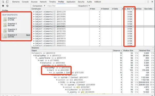 点击刷新后监控内存变化,下图中四组内存快照分别是初始,请求20次,请求40次,请求60次时的内存情况(有兴趣的可以用timeline进行实验)。因为每次刷新的数据是一致的,将snap4雨snap3进行比较,按照大小进行分类会看到有不少每20个一组的内存块,再查看它的gc路径,泄漏点就显而易见了,真的是chart先动手的。
