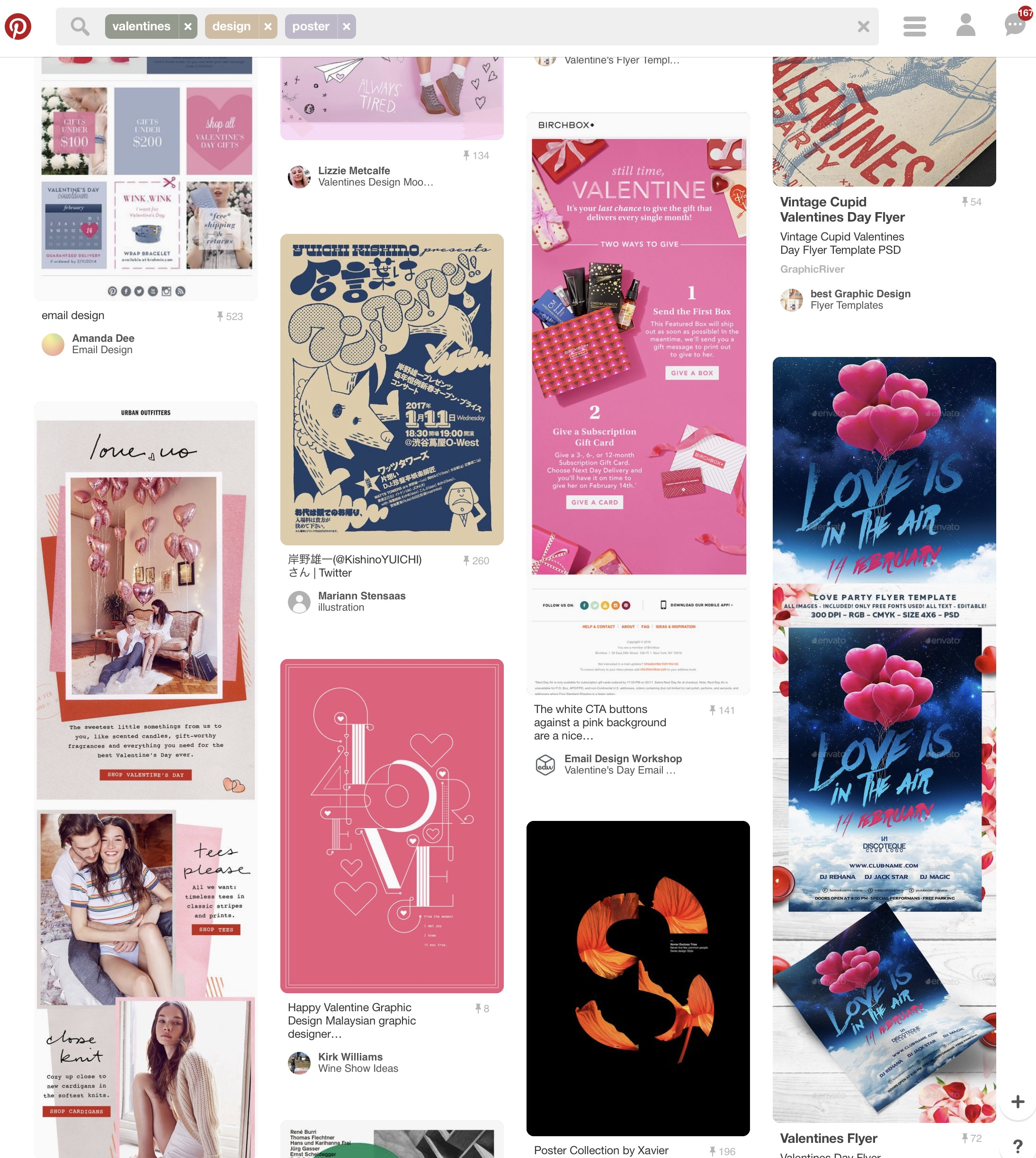 想了解更多的话,当然还是去pinterest搜索下关键词,比如valentines design poster,得到的答案会比较丰富一些,毕竟是国外的情人节嘛,基本上国外什么颜色都有用,比如黑色啊白色啊什么的,没什么忌讳。