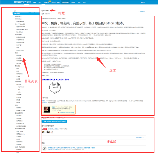 开始写爬虫前,我们先来分析一下该网站1的页面结构,网页的左侧是教程的目录大纲,每个 URL 对应到右边的一篇文章,右侧上方是文章的标题,中间是文章的正文部分,正文内容是我们关心的重点,我们要爬的数据就是所有网页的正文部分,下方是用户的评论区,评论区对我们没什么用,所以可以忽略它。