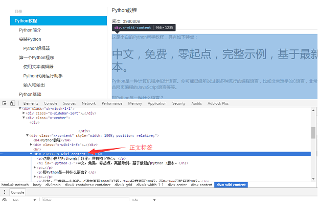 用 Chrome 浏览器找到页面正文部分的标签,按 F12 找到正文对应的 div 标签: <div class="x-wiki-content">,该 div 是网页的正文内容。用 requests 把整个页面加载到本地后,就可以使用 beautifulsoup 操作 HTML 的 dom 元素 来提取正文内容了。